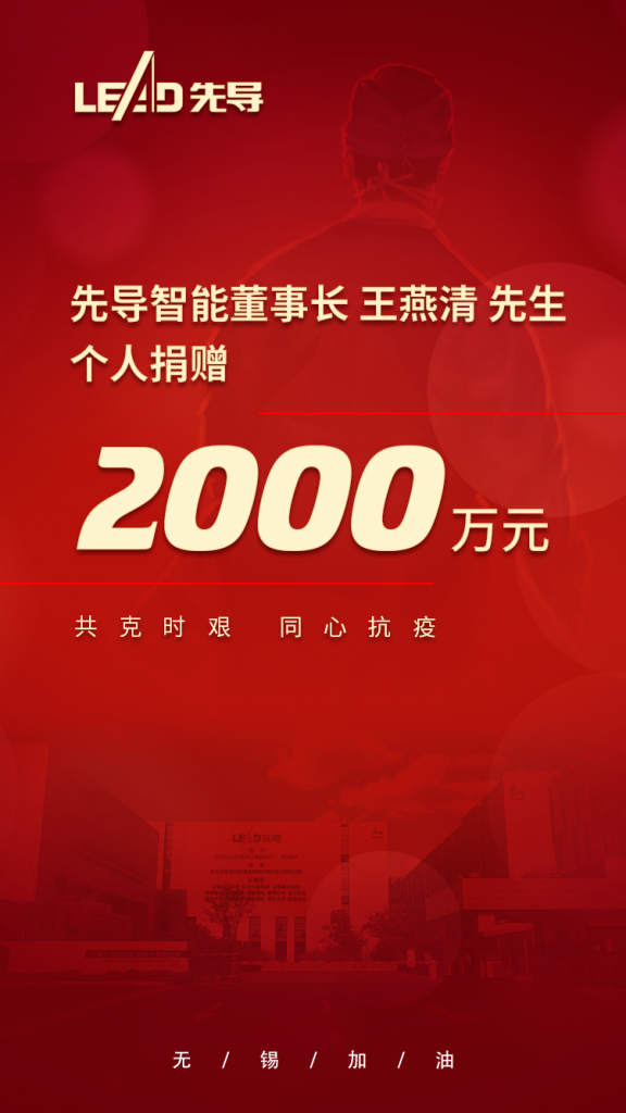 7월 13일, LEAD 동사장 왕연청(Wang Yanqing)께서는 코로나 전염병 예방 및 통제의 최전선을 지원하기 위해 개인 명의로 무석시 신오구 자선총회에 2000만 RMB를 기부하셨습니다. 코로나 발생 이후 왕연청 동사장은 여러 차례 기부금과 코로나 대항용 물자를 기부하셨으며 기업을 이끌고 정부의 전염병 예방 및 통제 요구 사항을 엄격히 이행하고 모든 직원과 함께 어려움을 극복하십니니다.